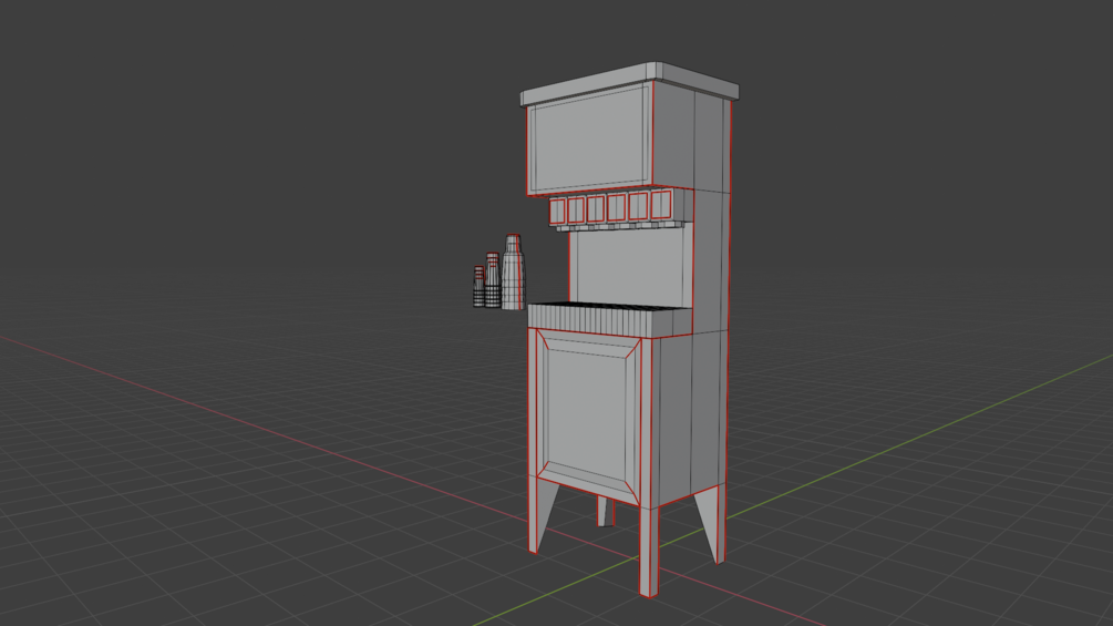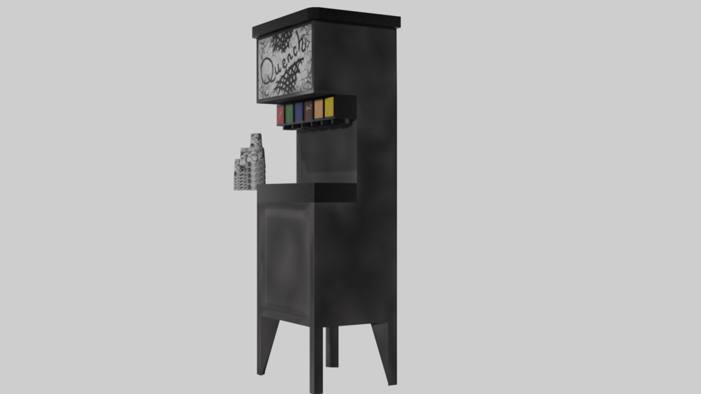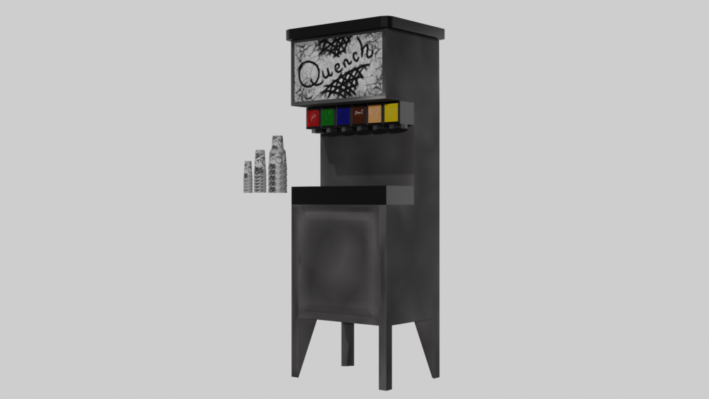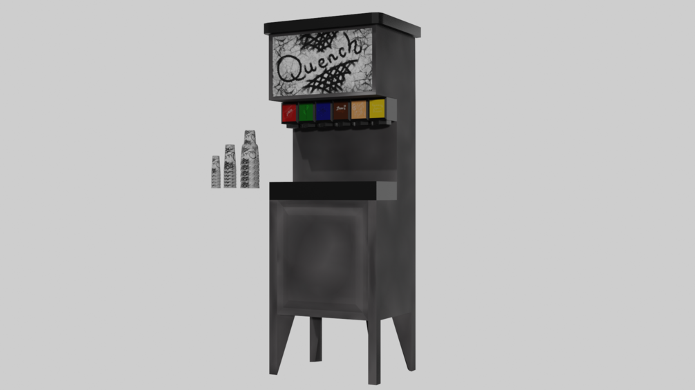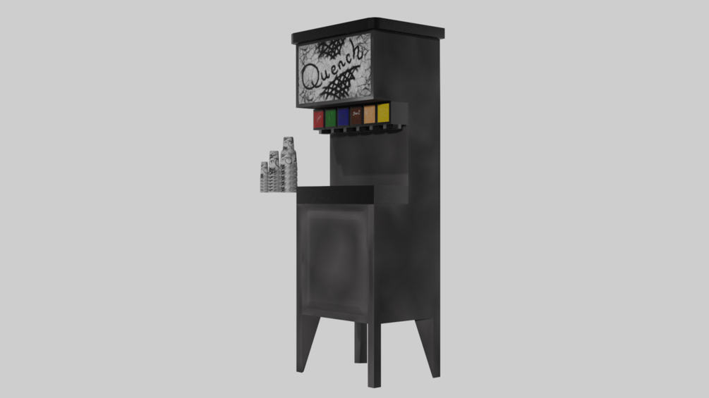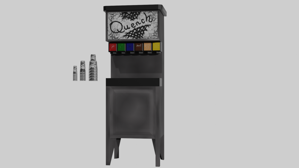 This soda machine is perfect for near any restaurant, pizarria, or connivance store. It comes with six individual flavors and an exterior hand painted to look well loved and well used. It comes with three sizes of cups, medium, large, and jumbo. Much like any you would find in your day to day life.